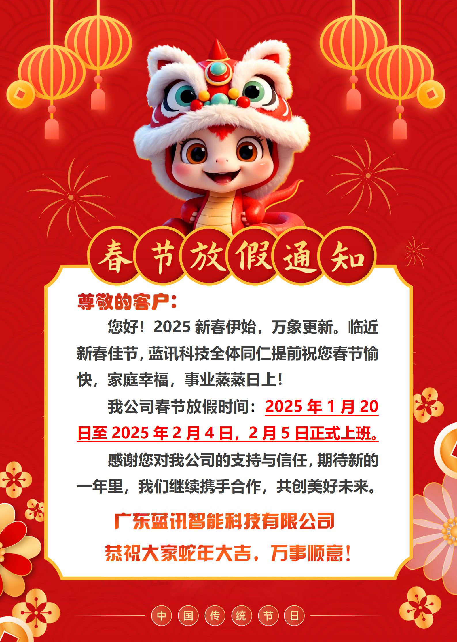 我公司春節(jié)放假時(shí)間:2025年1月20日至2025年2月4日,2月5日正式上班。感謝您對(duì)我公司的支持與信任,期待新的一年里,我們繼續(xù)攜手合作,共創(chuàng)美好未來(lái)。