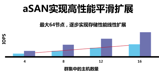 aSV+aSAN虛擬化方案可以支持橫向(增加服務(wù)器數(shù)量)、縱向(增加單臺(tái)服務(wù)器的內(nèi)存,SSD,硬盤(pán)數(shù)量)等擴(kuò)展方式,擴(kuò)展起來(lái)非常簡(jiǎn)單,只需要將新的服務(wù)器加入原來(lái)的集群就可以實(shí)現(xiàn)擴(kuò)展,無(wú)需復(fù)雜配置。擴(kuò)展后可以實(shí)現(xiàn)容量和性能的同步擴(kuò)展,目前最大支持64臺(tái)服務(wù)器組件一個(gè)集群。